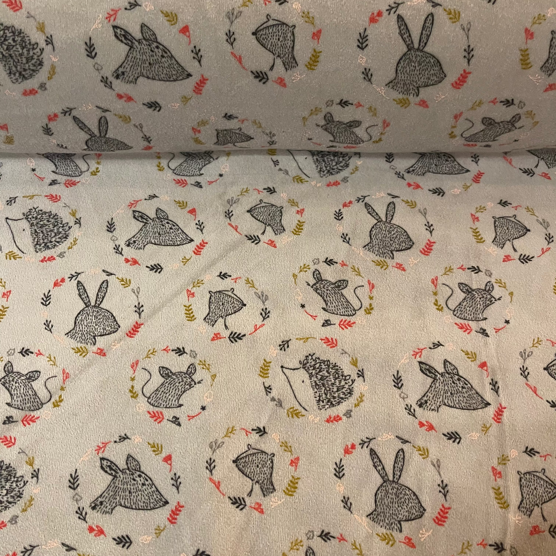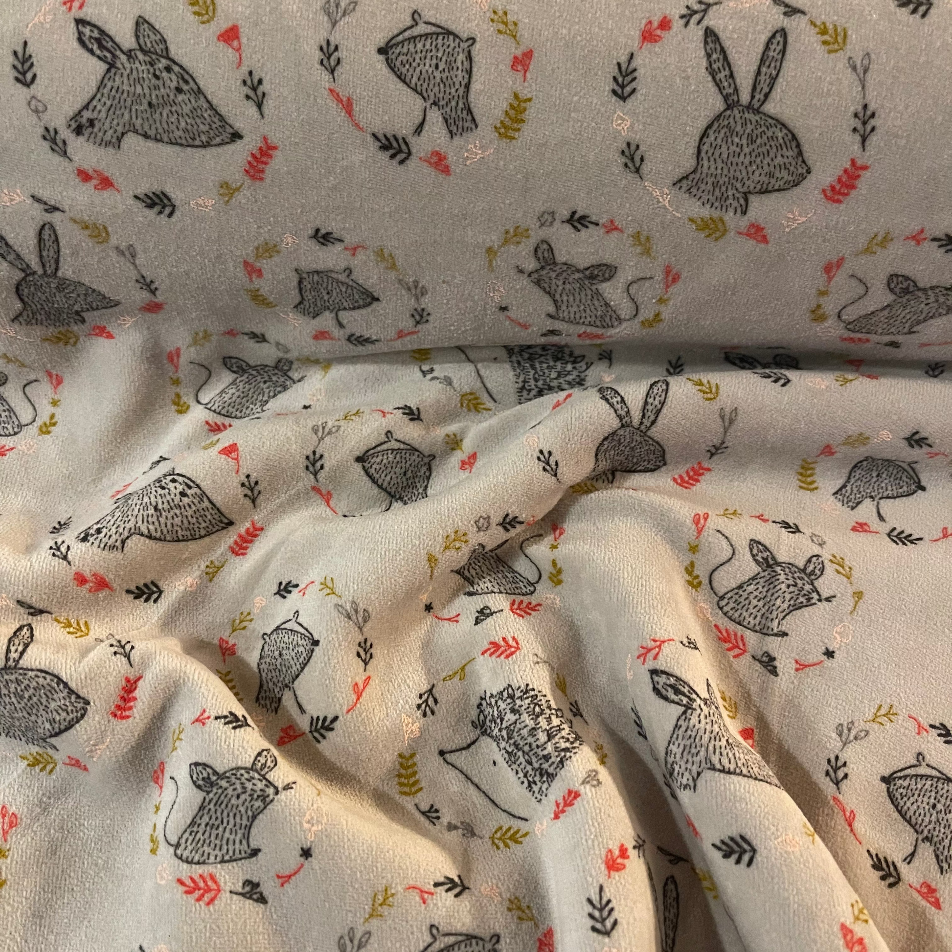 Très beau Nicky avec des animaux de la forêt sur fond gris. Ce tissu sera idéal pour la confection de pyjamas.