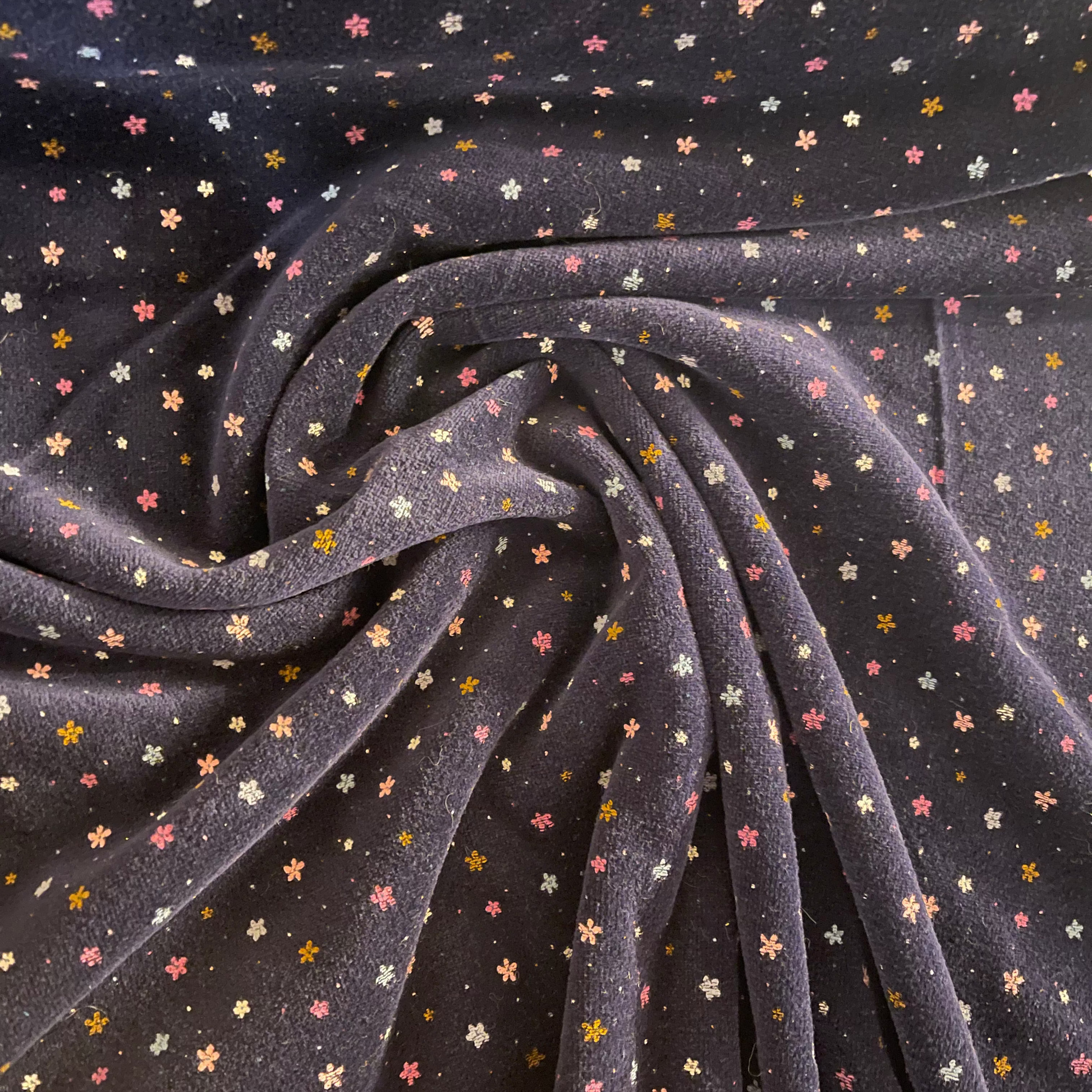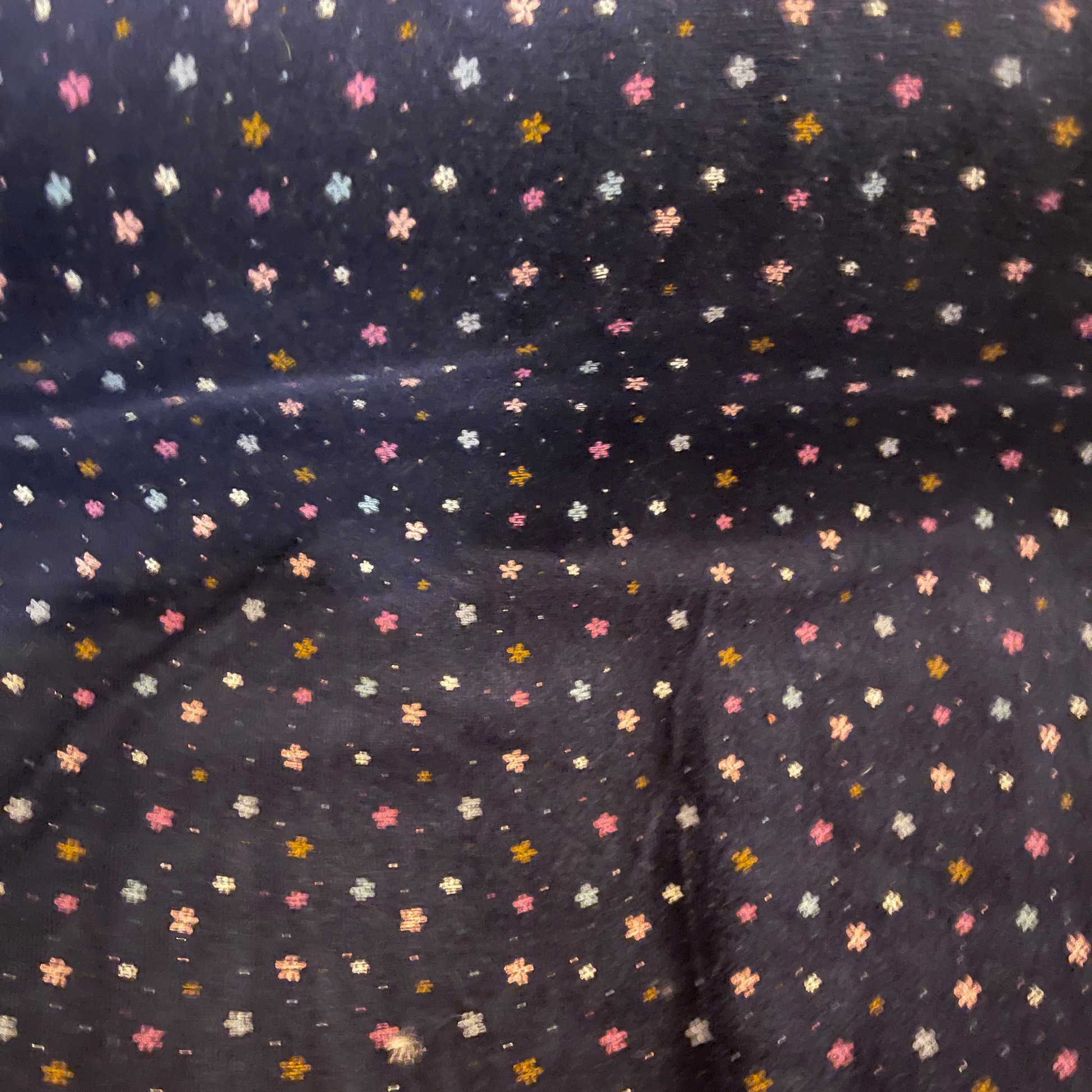 Très beau Nicky avec des fleurs de différentes couleurs sur fond bleu marine. Ce tissu sera idéal pour la confection de pyjamas.