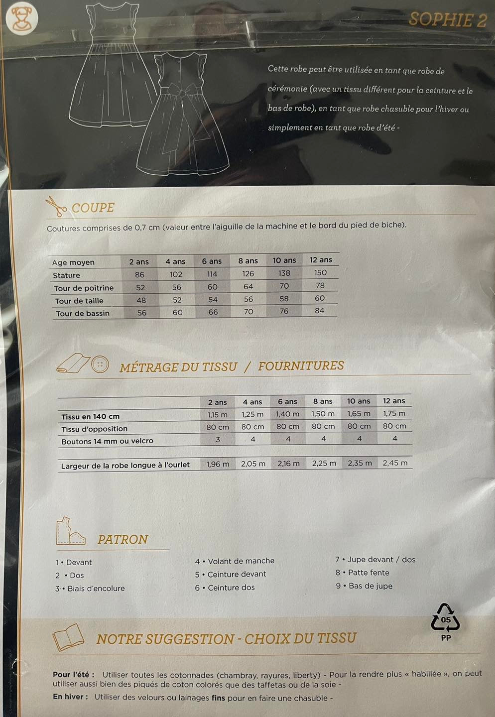 Tissu pour la robe : 2 ans : 1,15 m – 4 ans : 1,25 m – 6 ans : 1,40 m – 8 ans : 1,50 m – 10 ans : 1,65 m – 12 ans : 1,75 m