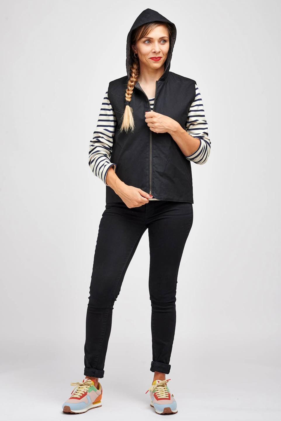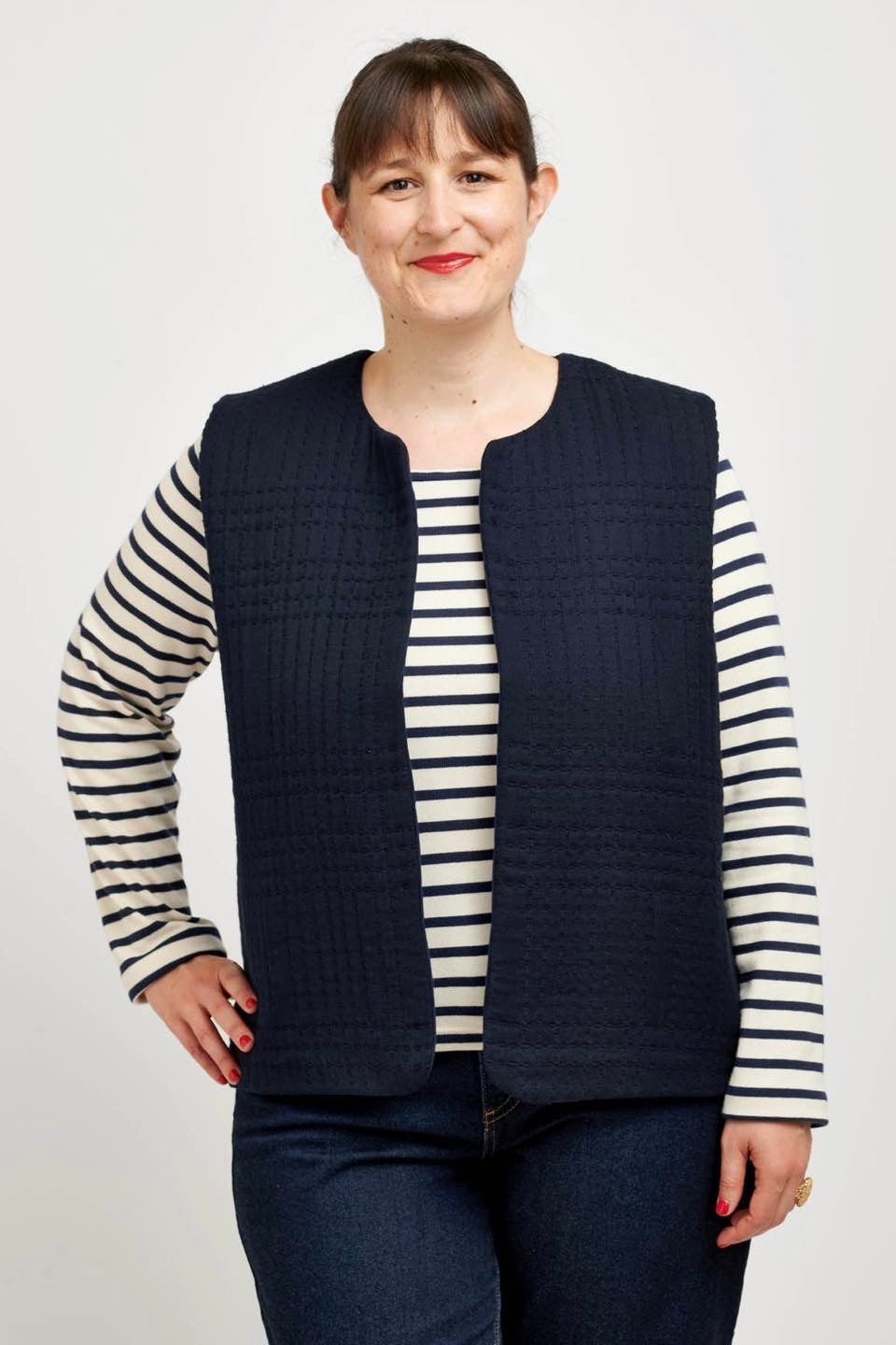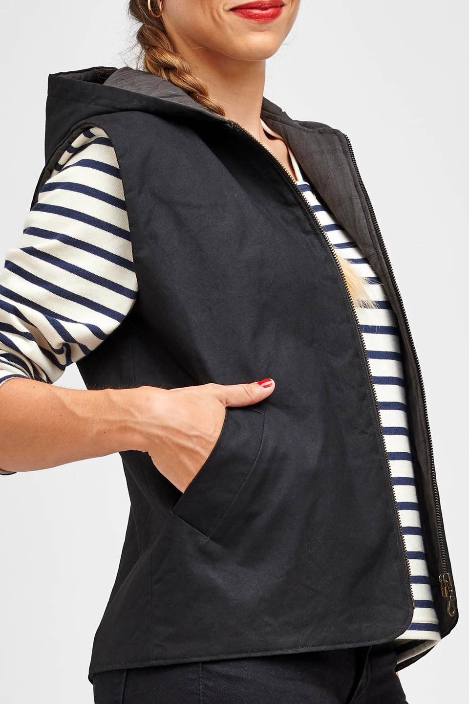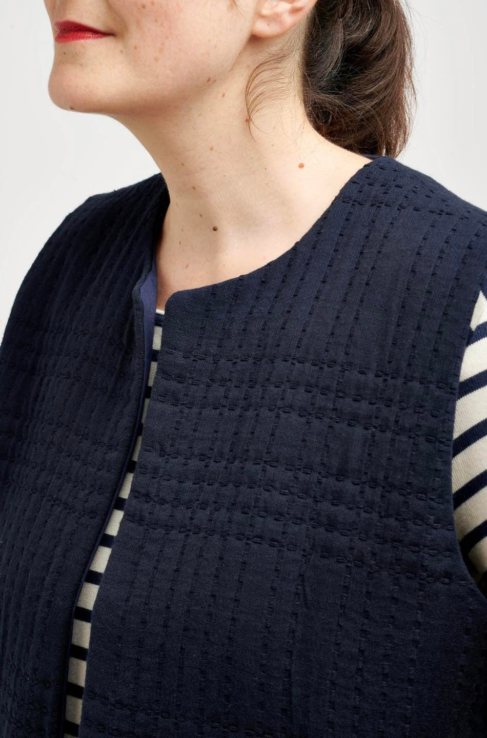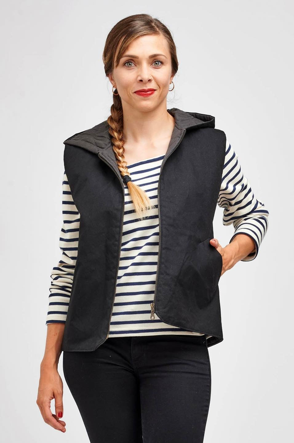 Je suis Hathor, une veste sans manches intemporelle qui s’intègre facilement dans une garde-robe durable. Je me décline en 18 versions grâce à 3 options d’encolure, 3 options de poches et 2 modes de fermeture. Je me ferme soit avec des boutons pressions, soit avec une fermeture à glissière et je suis entièrement doublée. J’ai, au choix, une encolure simple avec un bel arrondi, un col ou une capuche. On peut me coudre avec des poches plaquées, passepoilées ou sans poches. Je suis la petite veste parfaite pour me glisser sous un manteau pour les grands froids, comme veste de mi-saison, mais aussi pour les fraîches soirées d’été. En fonction des tissus utilisés, je peux aussi bien vous accompagner en ville en mode « doudoune », vous réchauffer pendant vos balades automnales ou bien vous protéger pendant votre jogging matinal. Bref, je suis parfaite pour chaque saison et chaque occasion.