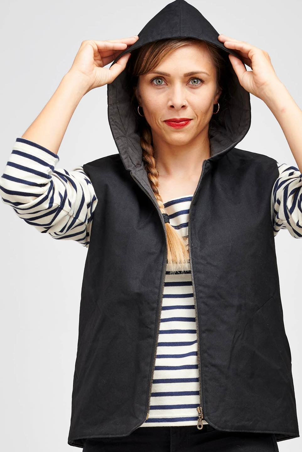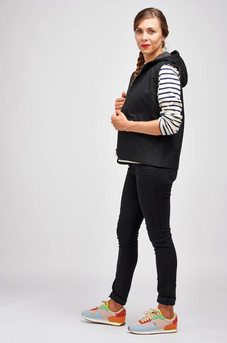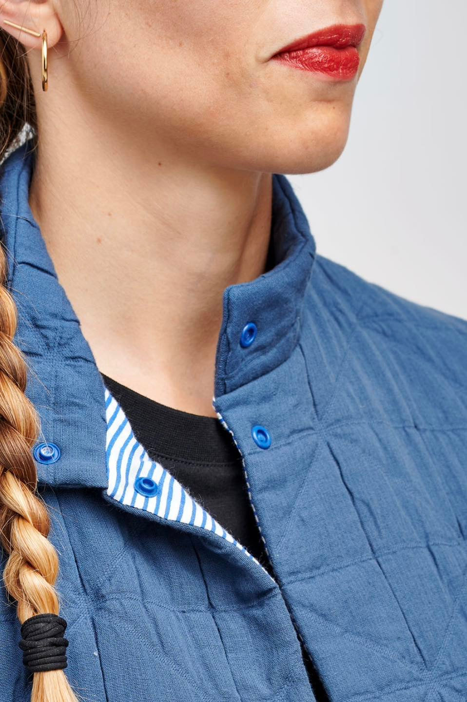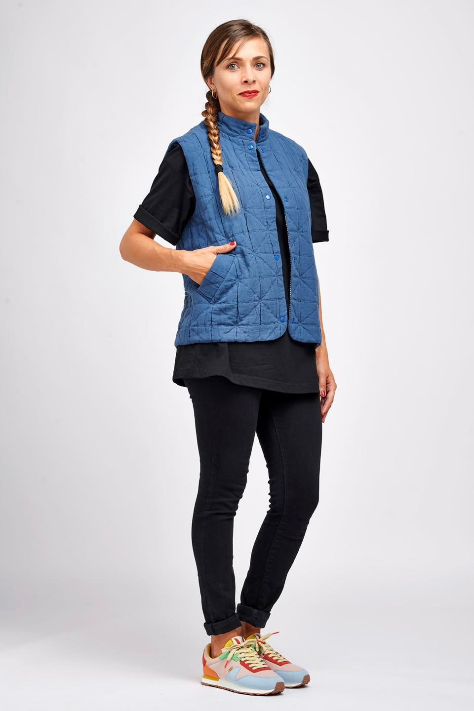 Je suis Hathor, une veste sans manches intemporelle qui s’intègre facilement dans une garde-robe durable. Je me décline en 18 versions grâce à 3 options d’encolure, 3 options de poches et 2 modes de fermeture. Je me ferme soit avec des boutons pressions, soit avec une fermeture à glissière et je suis entièrement doublée. J’ai, au choix, une encolure simple avec un bel arrondi, un col ou une capuche. On peut me coudre avec des poches plaquées, passepoilées ou sans poches. Je suis la petite veste parfaite pour me glisser sous un manteau pour les grands froids, comme veste de mi-saison, mais aussi pour les fraîches soirées d’été. En fonction des tissus utilisés, je peux aussi bien vous accompagner en ville en mode « doudoune », vous réchauffer pendant vos balades automnales ou bien vous protéger pendant votre jogging matinal. Bref, je suis parfaite pour chaque saison et chaque occasion.