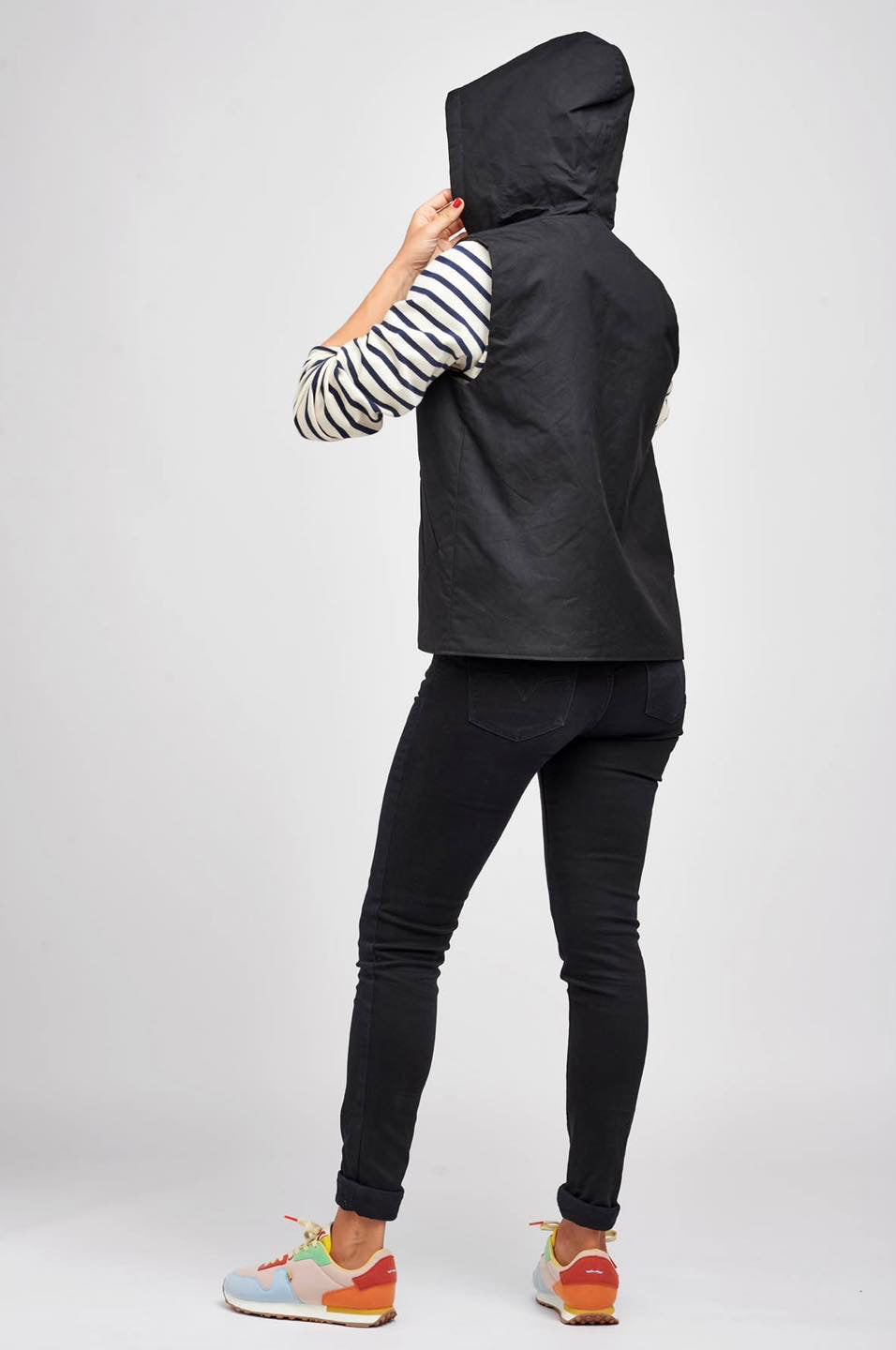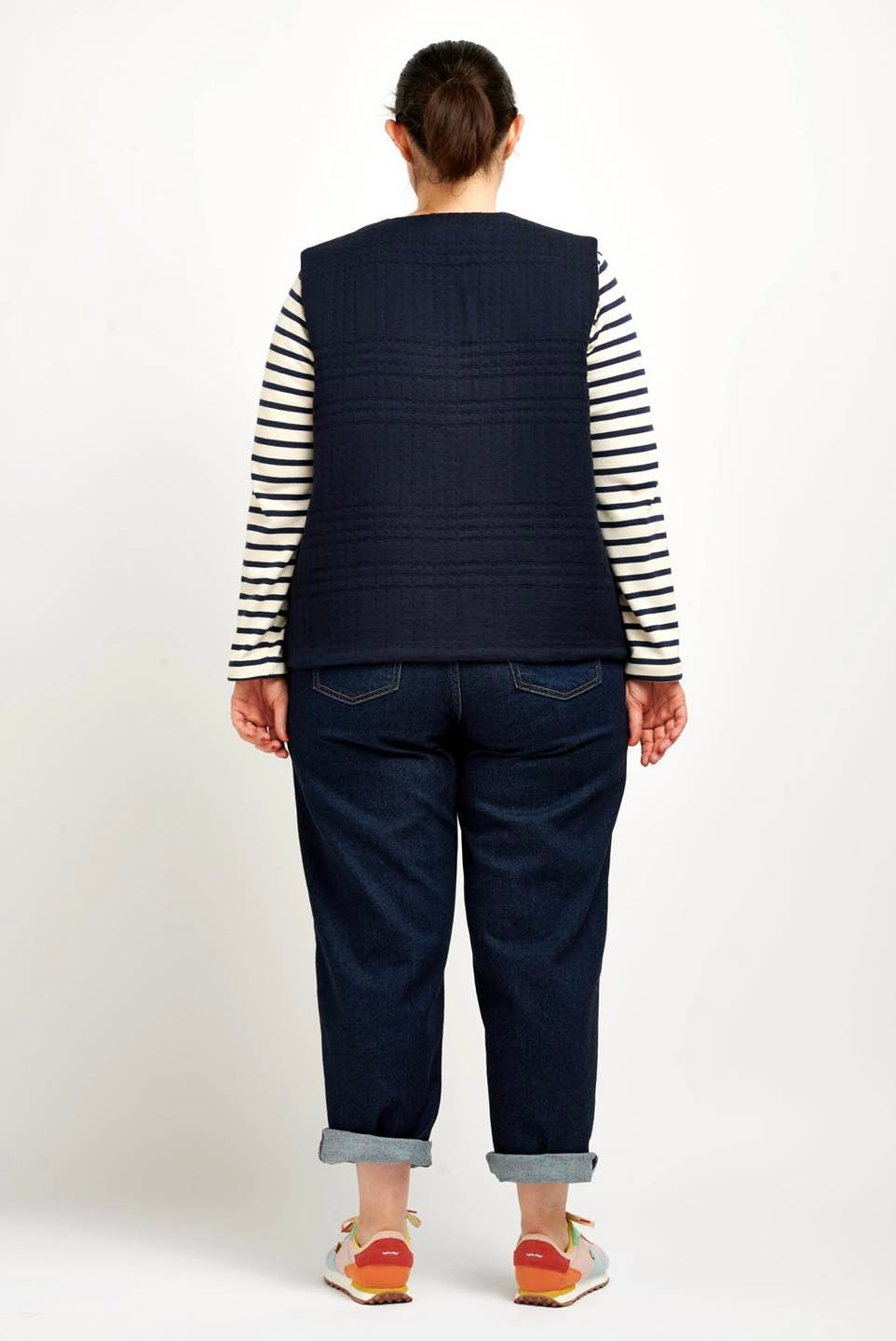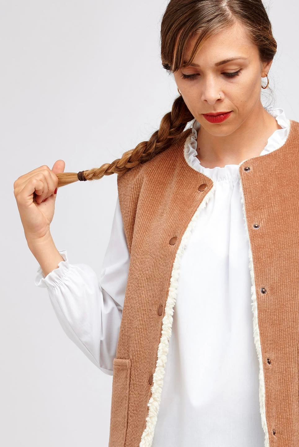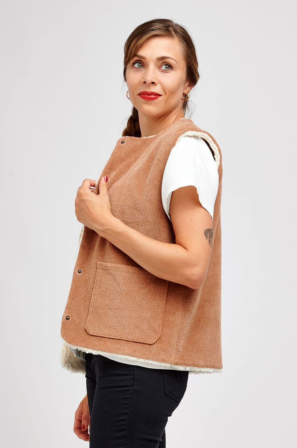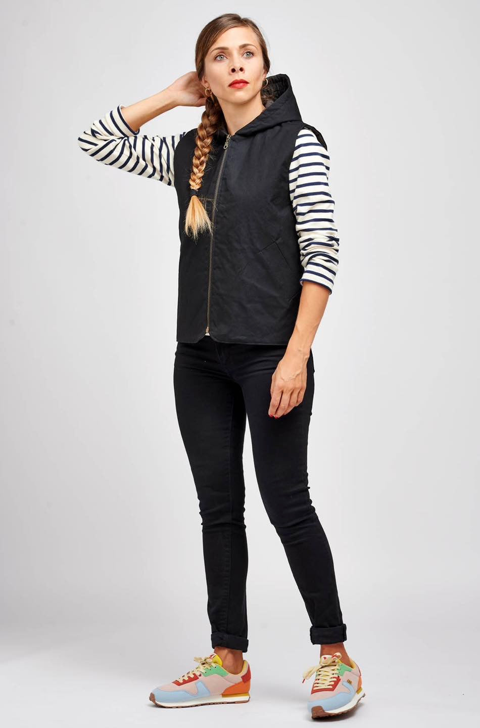 Je suis Hathor, une veste sans manches intemporelle qui s’intègre facilement dans une garde-robe durable. Je me décline en 18 versions grâce à 3 options d’encolure, 3 options de poches et 2 modes de fermeture. Je me ferme soit avec des boutons pressions, soit avec une fermeture à glissière et je suis entièrement doublée. J’ai, au choix, une encolure simple avec un bel arrondi, un col ou une capuche. On peut me coudre avec des poches plaquées, passepoilées ou sans poches. Je suis la petite veste parfaite pour me glisser sous un manteau pour les grands froids, comme veste de mi-saison, mais aussi pour les fraîches soirées d’été. En fonction des tissus utilisés, je peux aussi bien vous accompagner en ville en mode « doudoune », vous réchauffer pendant vos balades automnales ou bien vous protéger pendant votre jogging matinal. Bref, je suis parfaite pour chaque saison et chaque occasion.