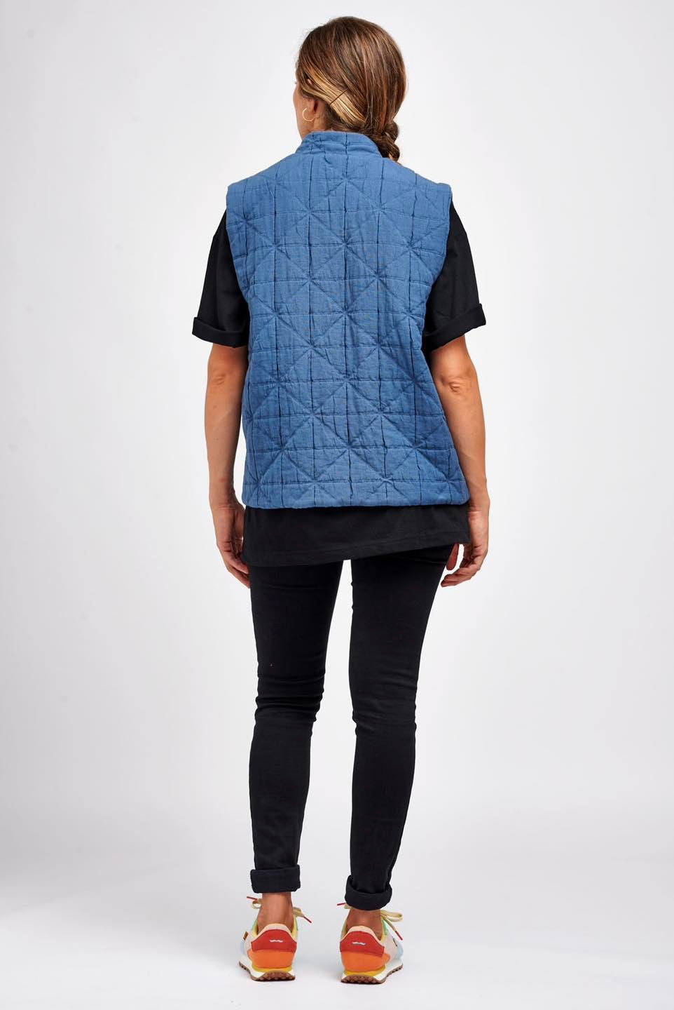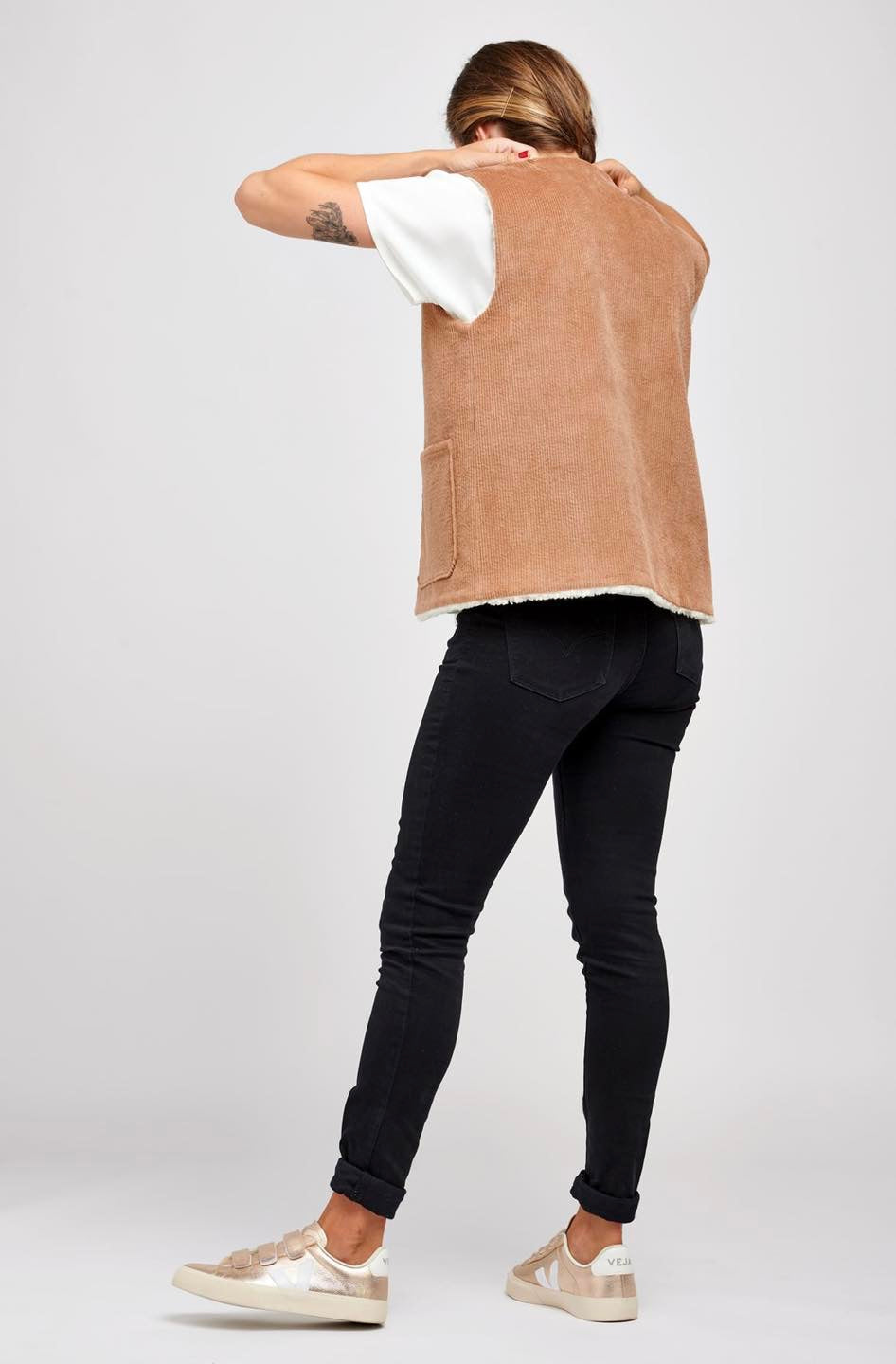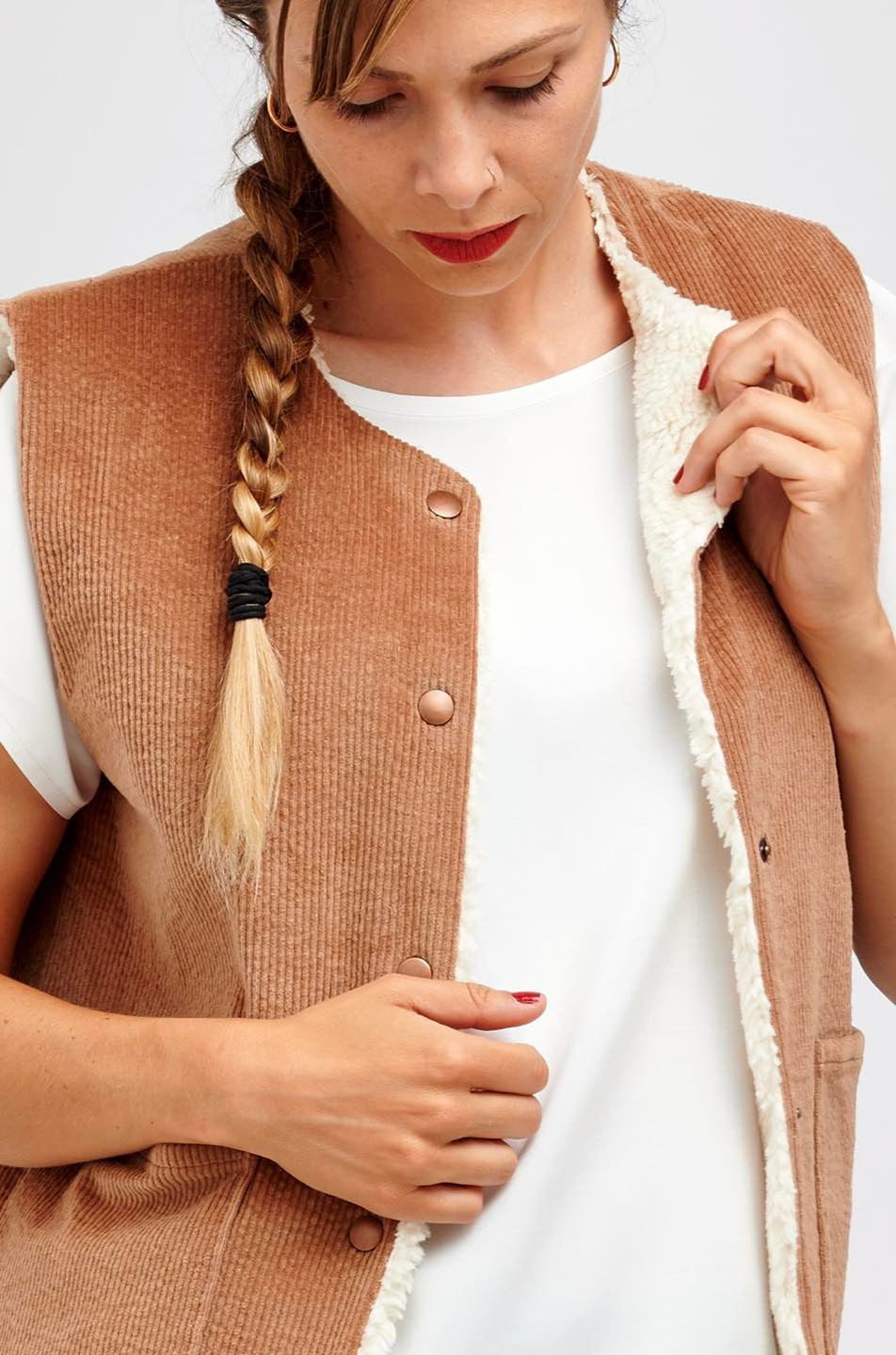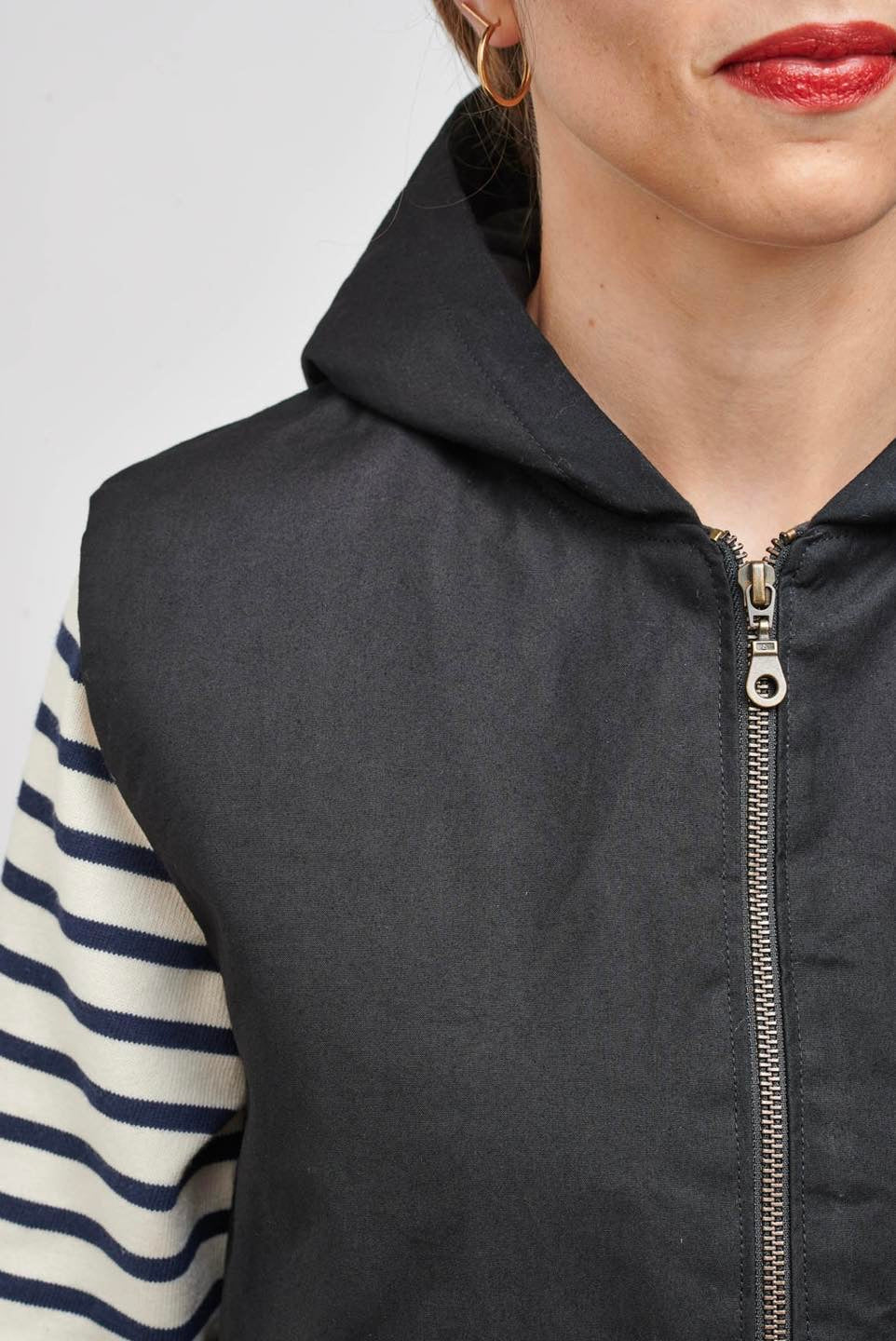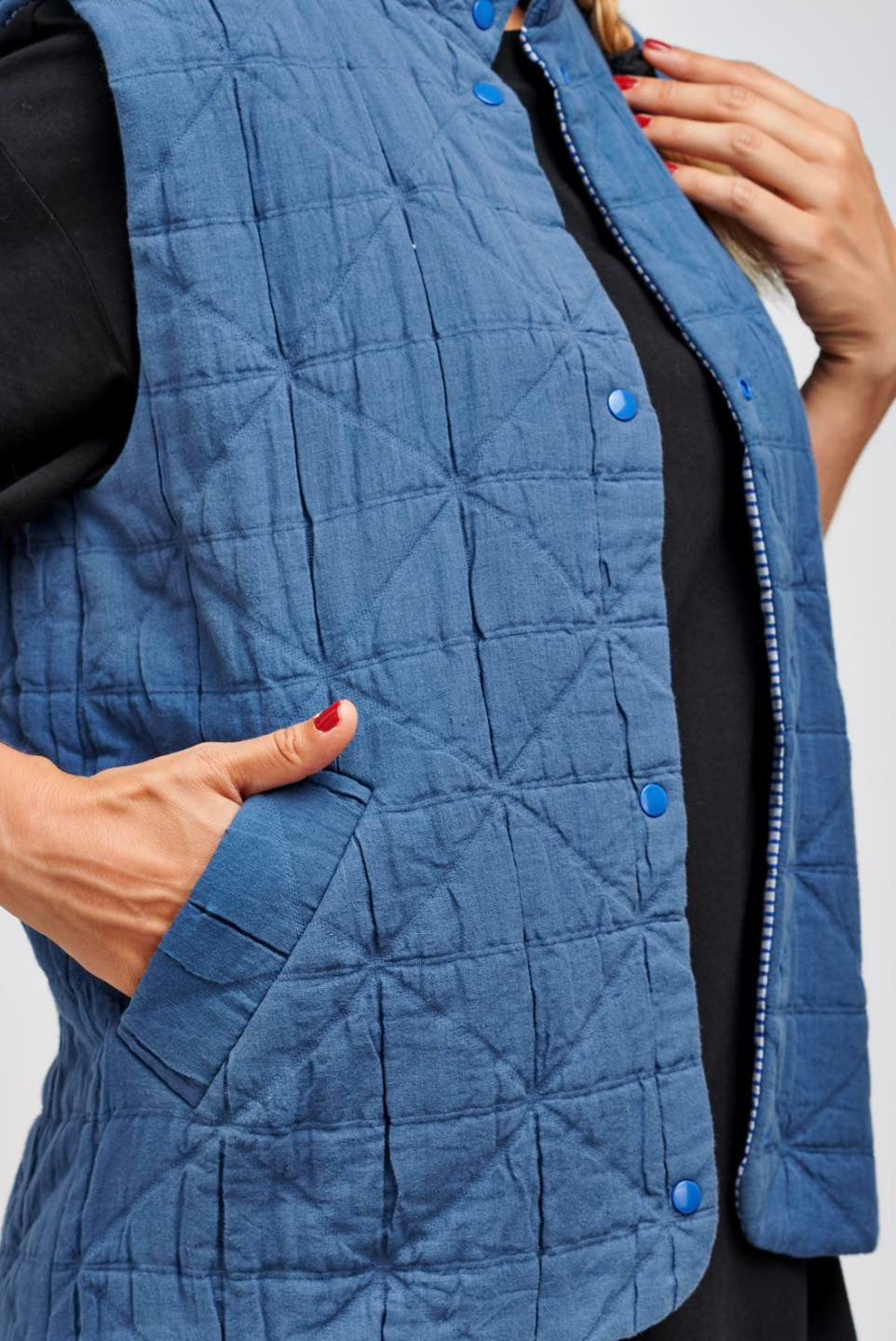 Je suis Hathor, une veste sans manches intemporelle qui s’intègre facilement dans une garde-robe durable. Je me décline en 18 versions grâce à 3 options d’encolure, 3 options de poches et 2 modes de fermeture. Je me ferme soit avec des boutons pressions, soit avec une fermeture à glissière et je suis entièrement doublée. J’ai, au choix, une encolure simple avec un bel arrondi, un col ou une capuche. On peut me coudre avec des poches plaquées, passepoilées ou sans poches. Je suis la petite veste parfaite pour me glisser sous un manteau pour les grands froids, comme veste de mi-saison, mais aussi pour les fraîches soirées d’été. En fonction des tissus utilisés, je peux aussi bien vous accompagner en ville en mode « doudoune », vous réchauffer pendant vos balades automnales ou bien vous protéger pendant votre jogging matinal. Bref, je suis parfaite pour chaque saison et chaque occasion.