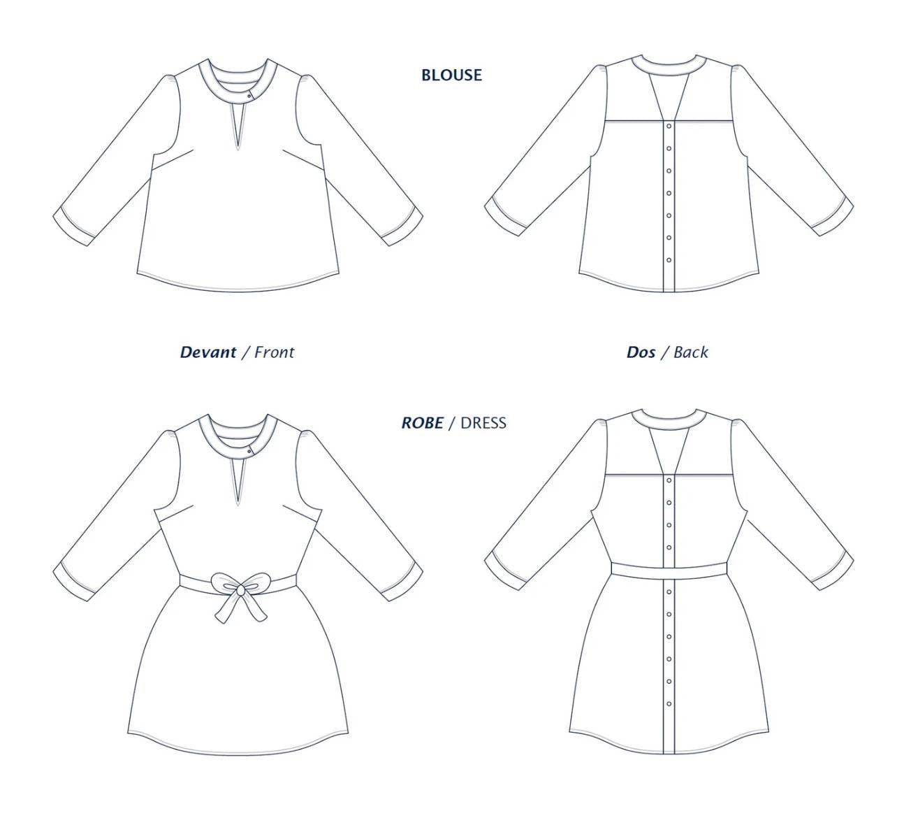 La pochette comprend un livret d'instructions détaillé pour coudre la robe ou la blouse et une planche de patron (aucune pièce superposée) en taille réelle.